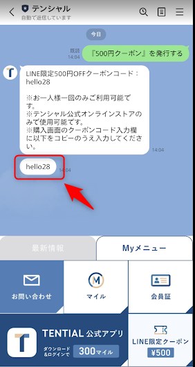 表示されたクーポンコード(英数字)をコピーする