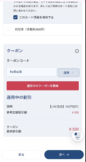 これで、クーポンが利用できる場合は、決済画面に反映されます。