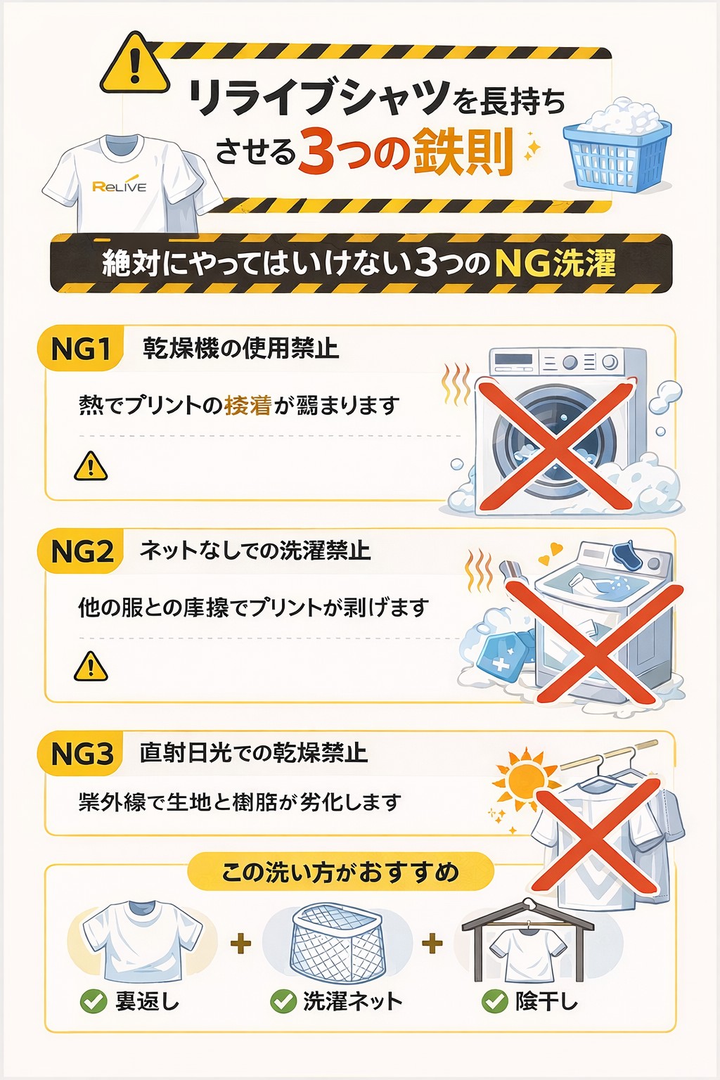 プリントを固定しているバインダー(樹脂)にとっての天敵は、物理的な「摩擦」と高温による「熱」です。これらを回避するだけで、1枚のリライブシャツを毎日洗っても1年以上、新品に近い状態で使い続けることが可能です。