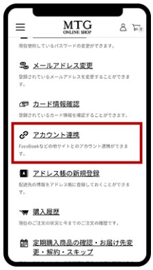 ① MTG ONLINESHOPにログインし、マイページ内の「アカウント連携」を選択します。