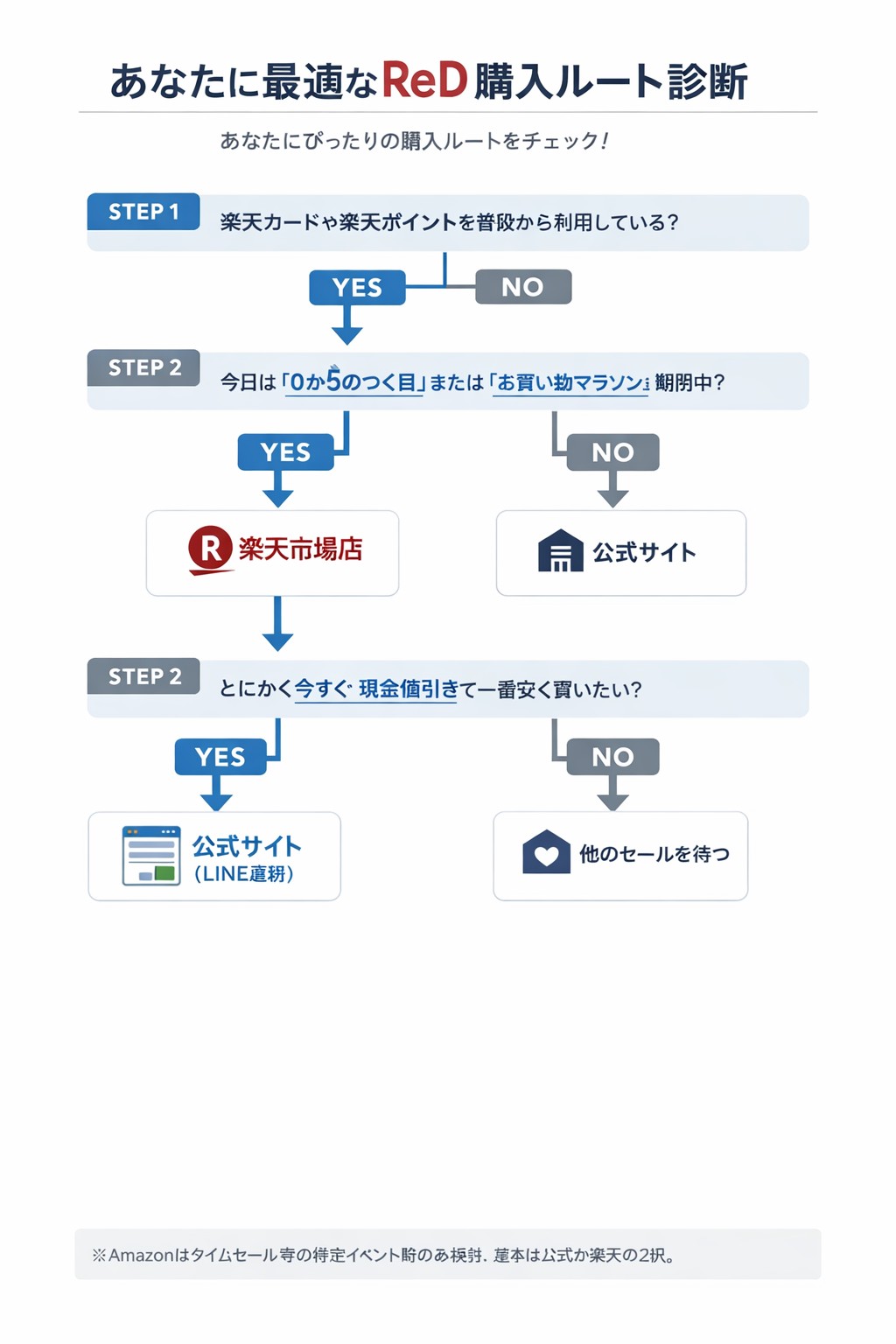 2025年現在、ReDをお得に購入できる主なルートは、あなたの「ポイント利用状況」によって、シンプルに2つに整理できます。