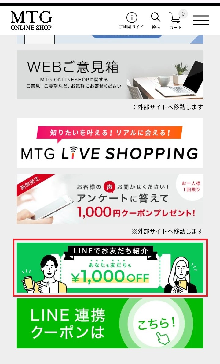 現在、MTG(製造・販売元)が案内している、ReD向けの代表的な割引施策が公式サイトのLINE友だち登録によるクーポンです。