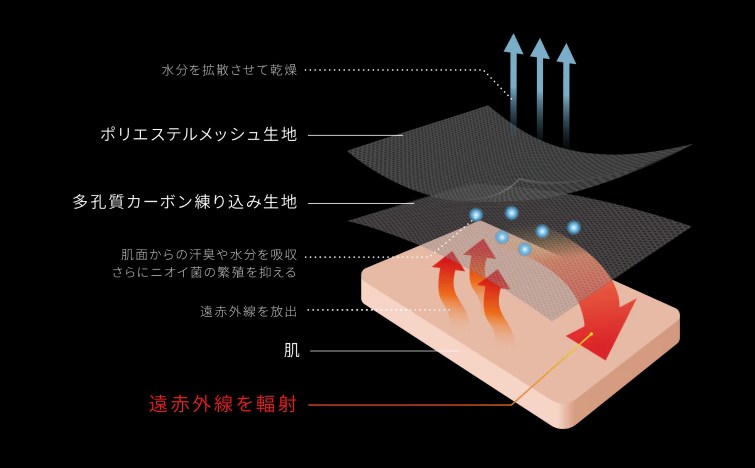 主な機能・独自素材 Triporous™(消臭・抗菌+遠赤外線) PHT繊維(ナノプラチナによるリラックス) SELFLAME®(極小セラミックスによる遠赤外線・温度調整)