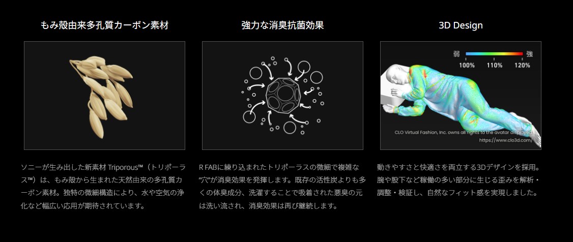 リカバリーウェア市場にはVENEXやBAKUNEなど様々な有名ブランドが存在し、どの製品も遠赤外線による血行促進機能を持っています。しかし、ソニーのR WEARの唯一無二の強みは、独自素材「Triporous™(トリポーラス)」による【圧倒的な消臭・抗菌力】にあります。